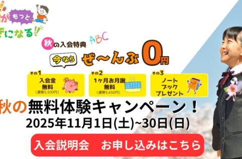 すっかりと秋の風が吹き、晴れやかな秋空が気持ちの良い季節となりましたね。 ダイヤモンドクラブではこの秋新たに英語に挑戦してみたいお子様を応援すべく、 11月1日〜11月30日までの期間【秋の浜松4校入...